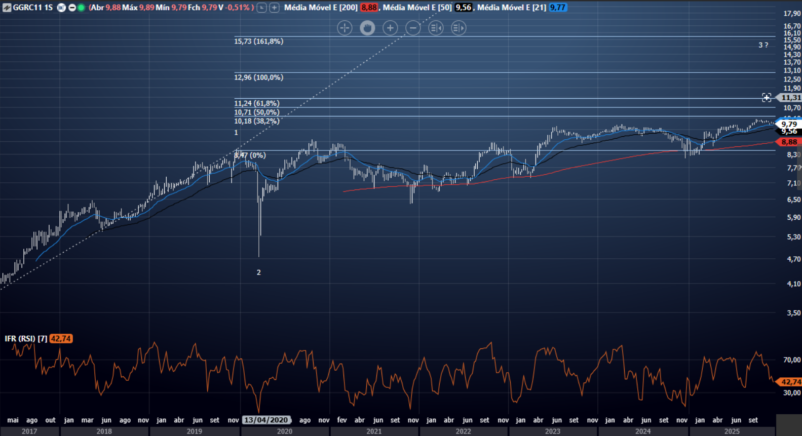 Acreditamos que GGR Covepi Renda FII (GGRC11) está formando a onda 3 do ciclo de alta que busca atingir a proximidade da região projetada de Fibonacci (161,8% a 261,0%). A próxima resistência se situa em R$ 10,18 (região projetada de 38,2% de Fibonacci) que se for rompida com volume acima da média e fechamento próximo a máxima ou candle de força positivo sinalizará ponto de compra para quem visa o curtíssimo prazo. O próximo suporte se situa em R$ 9,77 (média móvel de 21 dias) que se for respeitado com volume acima da média sinalizará ponto de compra para aqueles que visam o curto prazo também. O IFR de 7 dias está em 42,74 estando assim em uma região considerada neutra o que tende a levar o ativo a ter um comportamento próximo a estabilidade na próxima semana em meio a tendência de alta que segue vigente.