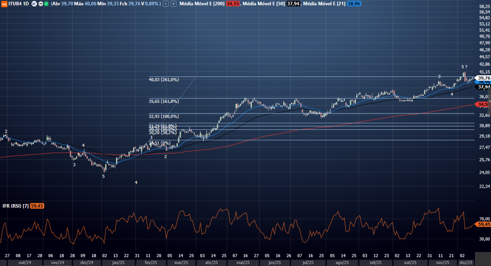 Para a posição de venda das ações do Itau Unibanco (ITUB4) recomendamos como forma de proteger parte desta posição a compra da opção ITUBA439 na mesma quantidade de venda da posição principal (ITUB4) em que esta opção terá vencimento para o dia 16/01/2026, ou seja, até esta data caso o ativo (ITUB4) seja negociado acima de R$ 41,71 para aqueles que tiverem posicionados na venda não irão perder mais. Com isso temos seis ativos recomendados alternando entre posição comprada e vendida o que nos leva ao peso de 16,7% para cada um dos ativos recomendados em que a análise gráfica pode alternar entre o período diário ou semanal.