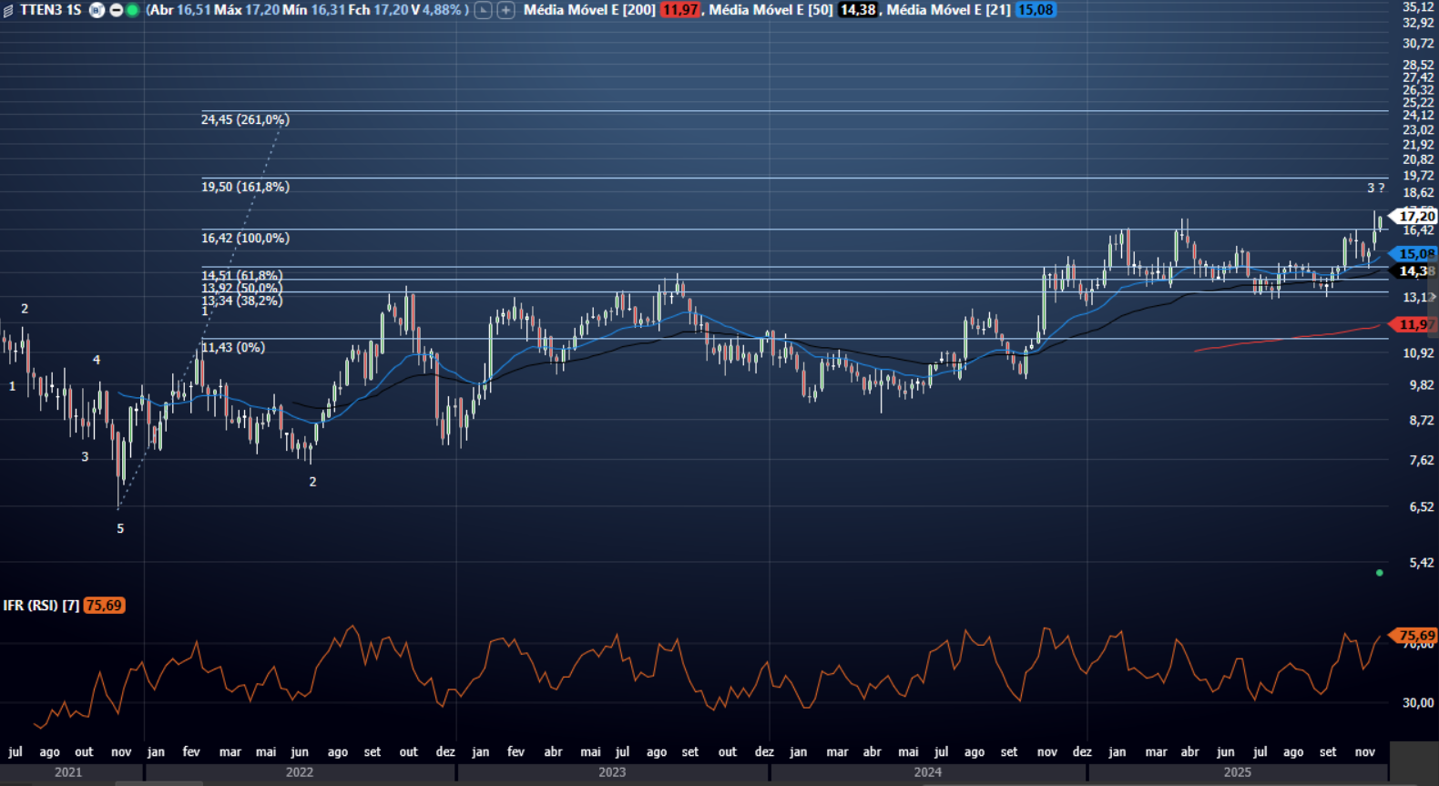 Acreditamos que as ações da 3 Tentos (TTEN3) estão formando a onda 3 do ciclo de alta que busca atingir a proximidade da região projetada de Fibonacci (161,8% a 261,0%). A próxima resistência se situa em R$ 19,50 (região projetada de 161,8% de Fibonacci) que caso seja rompida com volume acima da média e fechamento próximo a máxima ou candle de força positivo sinalizará ponto de compra para quem visa o curtíssimo prazo. O próximo suporte se situa em R$ 16,42 (região projetada de 100,0% de Fibonacci) antiga resistência que se for respeitado com volume acima da média sinalizará ponto de compra para aqueles que visam o curto prazo também. O IFR de 7 dias está em 75,69 estando assim em uma região considerada sobrecompra o que tende a levar o ativo a ter uma queda na próxima semana em meio a tendência de alta que segue vigente.
